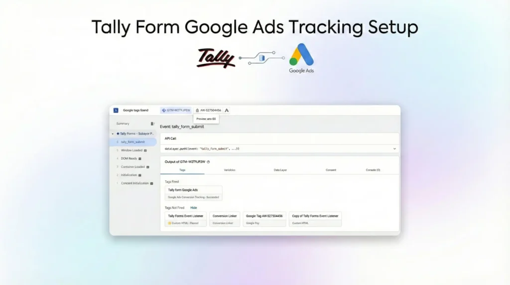 In this guide, we will solve this problem completely. We will build a custom tracking setup using Google Tag Manager that “listens” for Tally’s success message and sends that data directly to Google Ads. We will also cover Enhanced Conversions for better accuracy and Consent Mode V2 to keep you legally compliant.